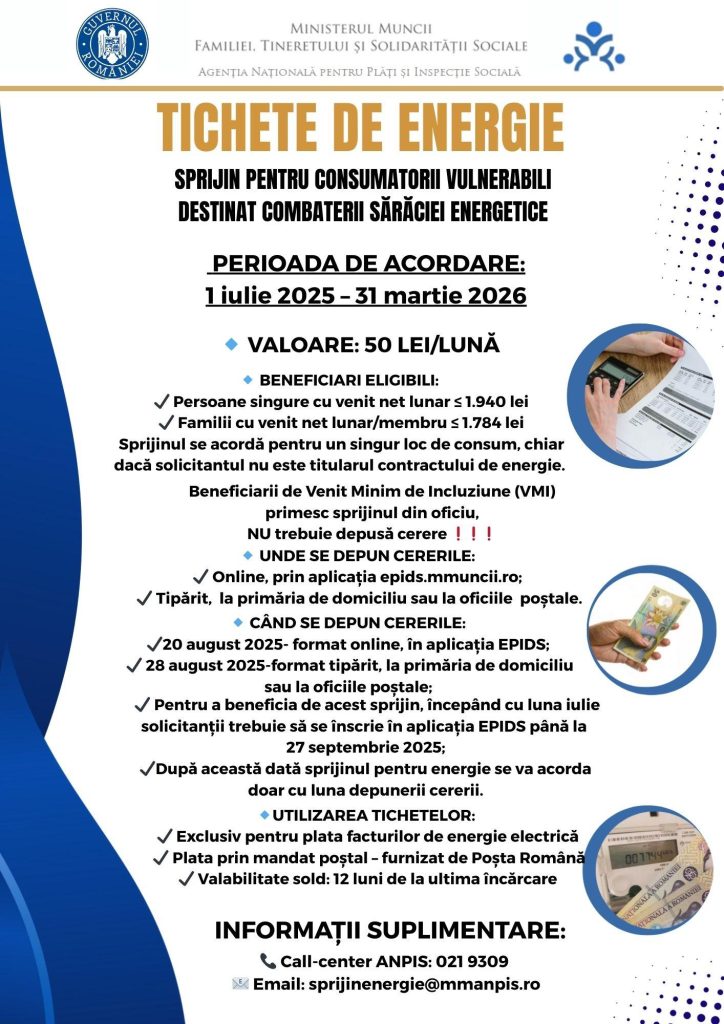 Anunţ privind acordare sprijin pentru consumatorii casnici de energie electrică aflaţi în situaţie de sărăcie energetică – OUG 35/2025 şi Cerere solicitare ajutor Posted on 26.08.2025Categories Informări